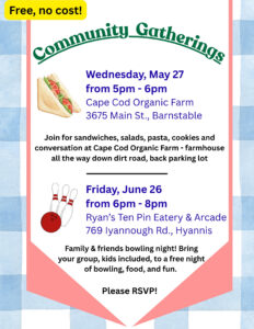 A free casual dinner and chat night on Wednesday, May 27 from 5pm – 6pm at Cape Cod Organic Farm on Route 6A/Main Street in Barnstable. Address is 3675 Main Street, Barnstable, MA. We’ll have sandwiches, pasta, salads, lemonade, ice tea, water, cookies, and other snacks. This is part of our monthly farmer and food producer gatherings. We are meeting every month at different locations across Cape Cod. These monthly events are made possible by MA Dept. of Agricultural Resources (MDAR) as part of their MassGrown Farmer Wellness Program. All monthly events are free and open to all Cape Cod food business owners and farmers (land and sea). Some months we’re just having casual get-togethers and meals like in May, other months we have more formal dinners at restaurants, bowling nights for the family, yoga sessions, cooking demos, and other outdoor adventures — but it’s always free and we encourage you to come. Please RSVP whenever possible or required so that we know you’re coming. You don’t need to attend every month but you’re welcome to join as many monthly gatherings as you can join!